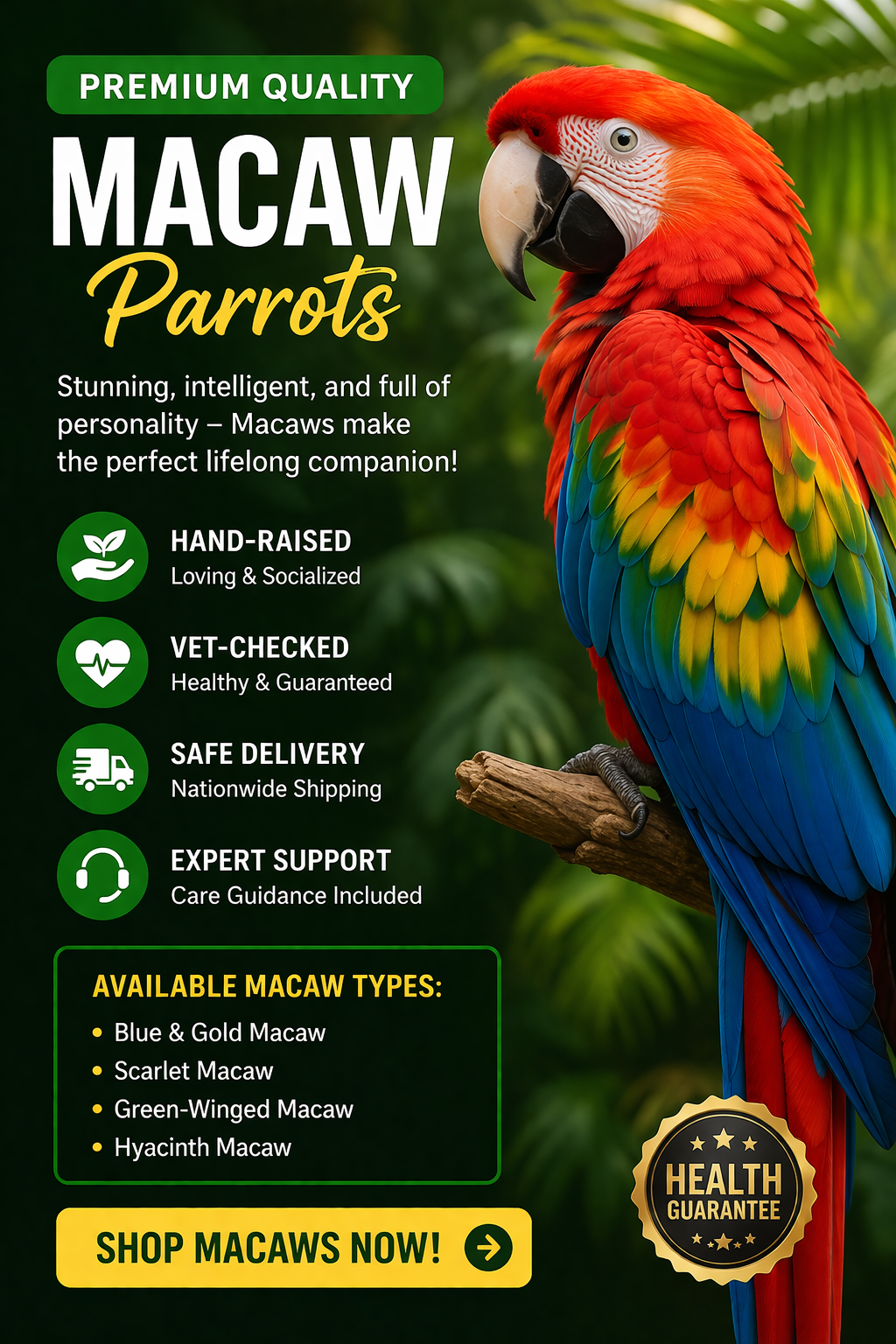 Rare Blue Hyacinth Macaws, hand-raised, healthy, and known for gentle personalities.